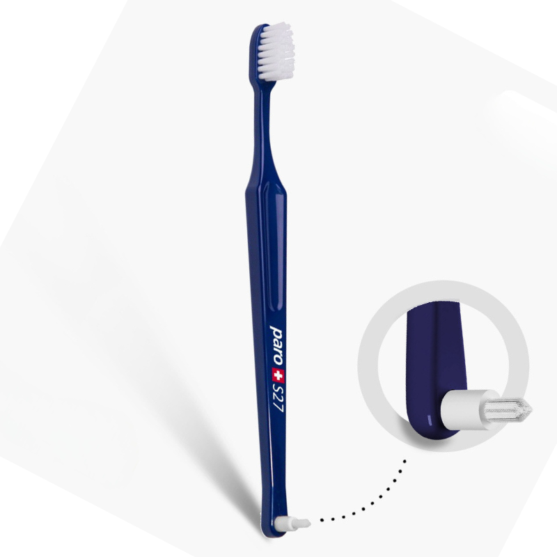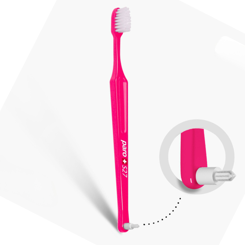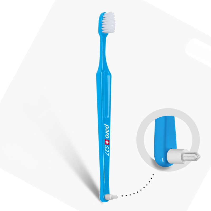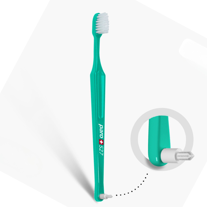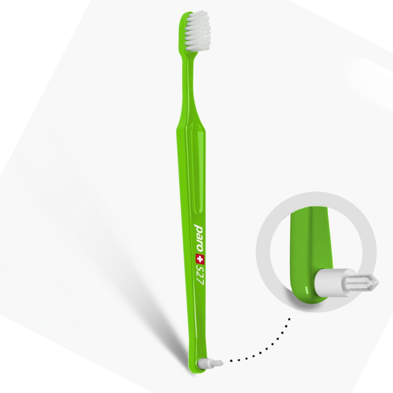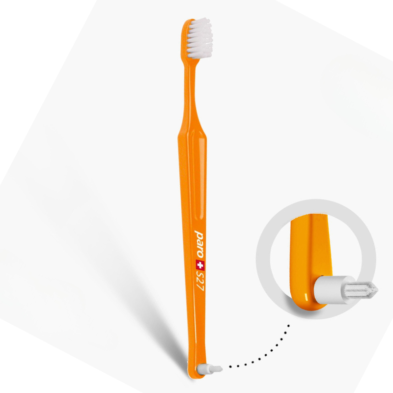 Двостороння дитяча зубна щітка Рaro М27 зі змінною монопучковою насадкою Рaro interspace brush F для чищення між зубамита, та з 27 пучками м'яких щетинок. Ідеально підходить для людей, які носять брекети. Закруглена нейлонова щетина дозволяє інтенсивно видаляти наліт і разом із цим оберігати чутливі ясна.