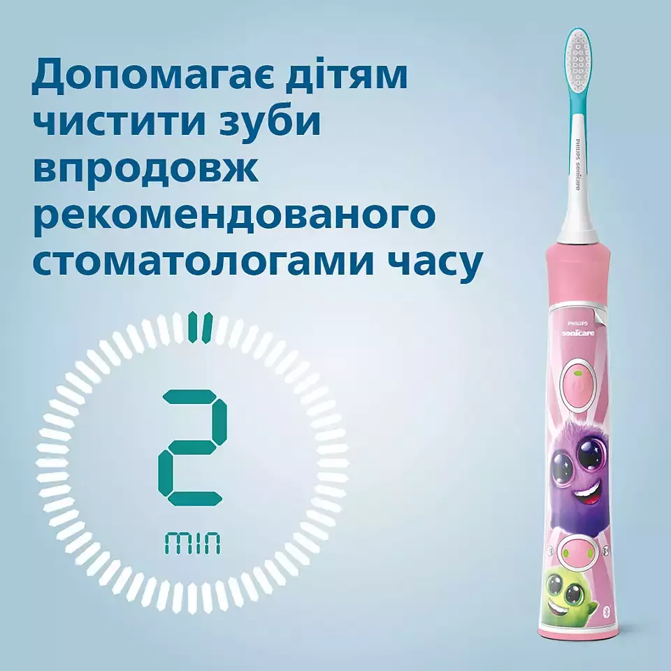Інтерактивна звукова сила. Цікаве, ефективне чищення. Зацікавте дітей, коли вони вчаться чистити зуби. Зубна щітка Philips Sonicare For Kids із підтримкою Bluetooth взаємодіє із цікавим додатком, який допомагає дітям краще й довше чистити зуби. Діти розважаються, вивчаючи техніки чищення, яке вони засвоять на все життя.