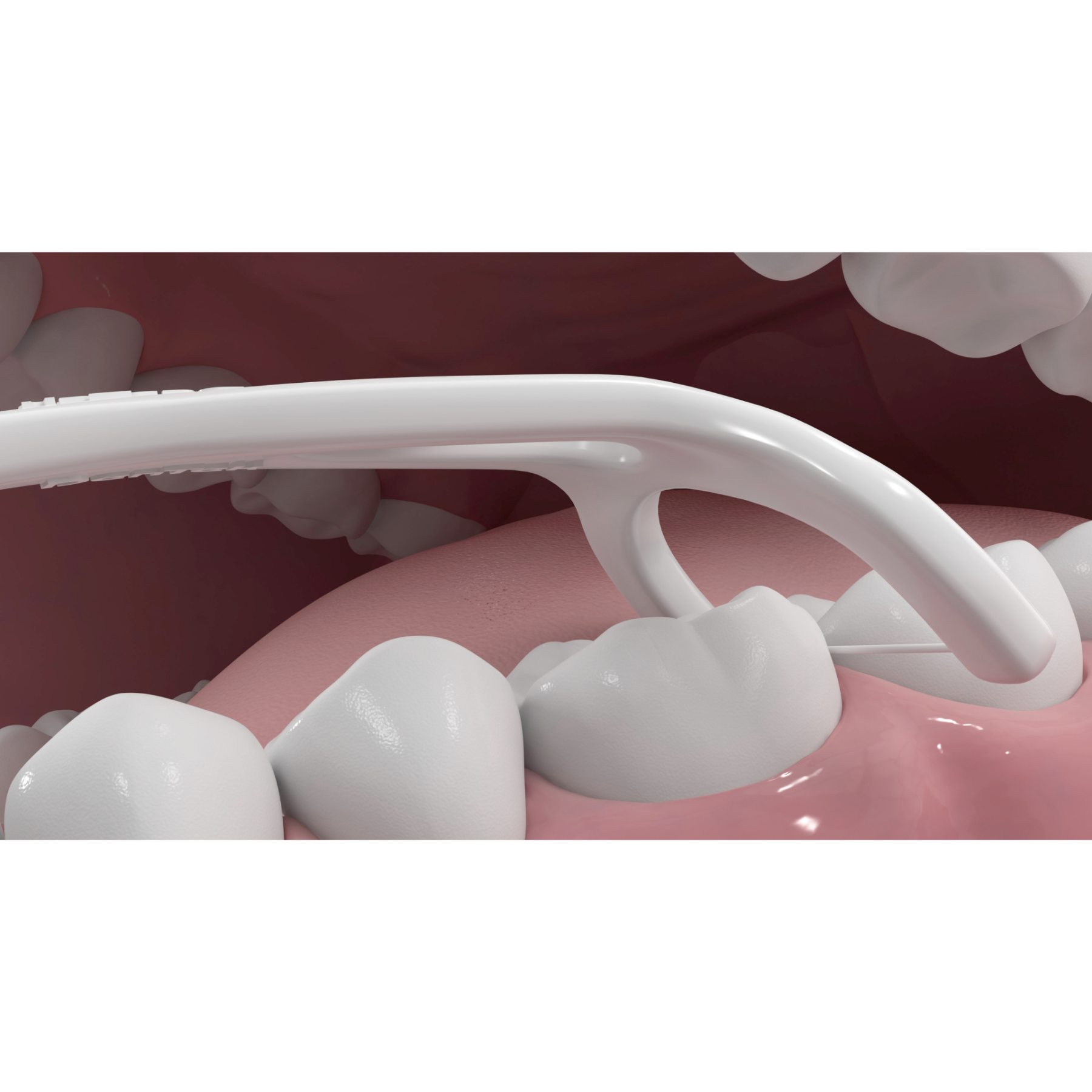 - Зубочистка Y-подібної форми з розташованою під кутом головкою з флосом легко дістає до задніх зубів