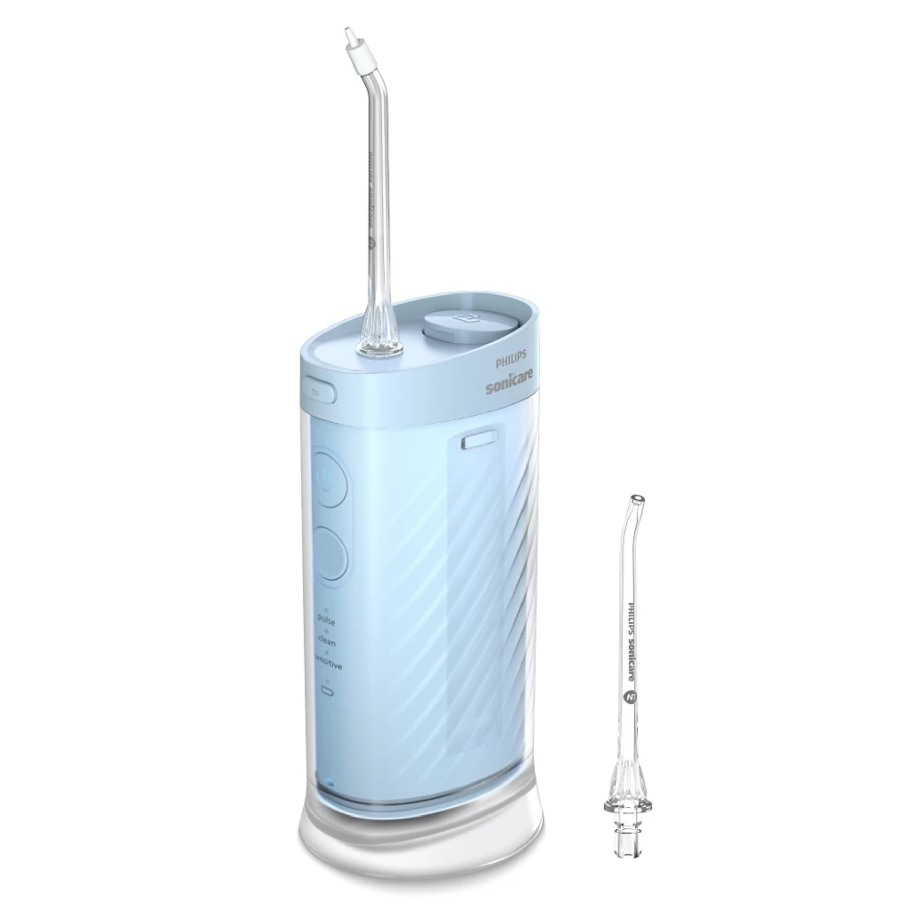Іригатор Philips Sonicare Compact Flosser – це швидкий, ефективний пристрій, який усюди можна взяти із собою. Іригатор усуває до 99,9% нальоту¹ між зубами та вздовж лінії ясен всього за 60 секунд.