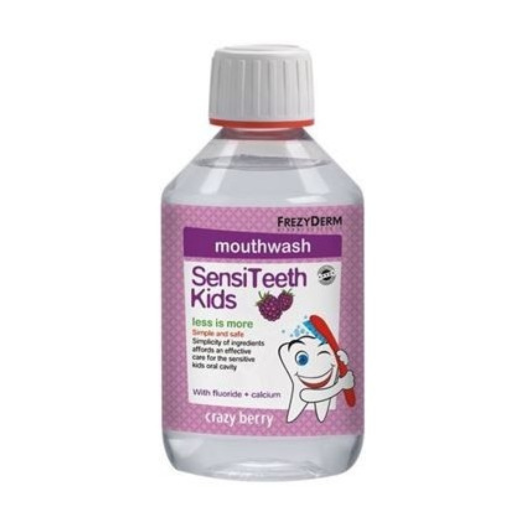 Ополіскувач для ротової порожнини FrezyDerm Sensiteeth Kids може використовуватися дітьми з 3 років для запобігання утворенню карієсу. Формула містить 125 ppm фтору та кальцію, які захищають від мікробів і подразнення ясен, а також зміцнюють зубну емаль. Має смачний смак чорниці і не містить глютену.