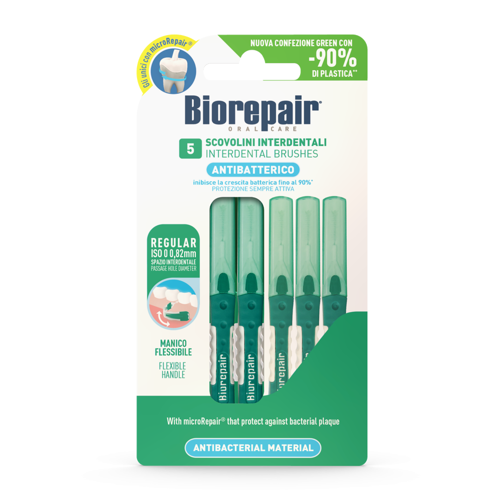 Проти бактерій, що викликають накопичення зубного нальоту, зубного каменю, карієсу та гінгівіту, які проникають у міжзубні проміжки та створюють кислу біоплівку, яка є роз'їдаючою для емалі. Нові міжзубні щітки Biorepair® з microRepair®, виготовлені з бактеріостатичного SCP, допомагають захистити простір від бактерій, до якого ваша зубна щітка не може дістатися.