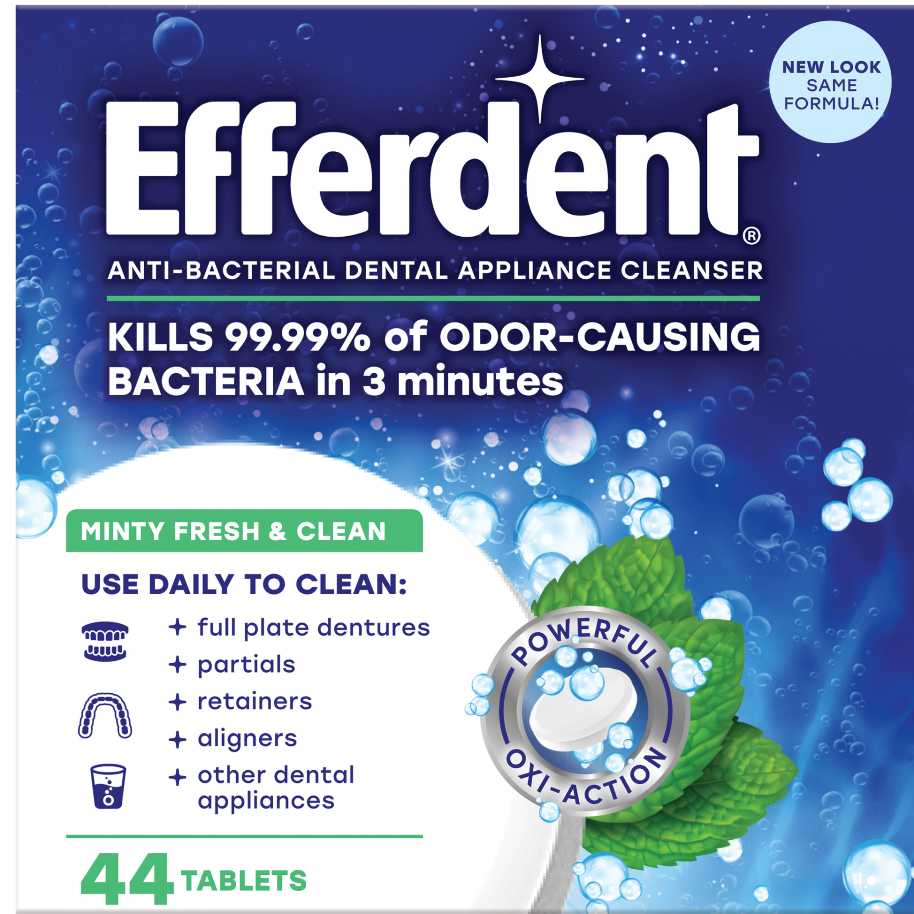 Efferdent М'ята свіжість та очищення Антибактеріальні таблетки борються з утворенням зубного нальоту та знищують бактерії, що викликають неприємний запах. Всього 3 хвилини, і Ваш пластиковий ретейнер чи інші стоматологічні конструкції стануть повністю чистими, свіжими та готовими до використання.