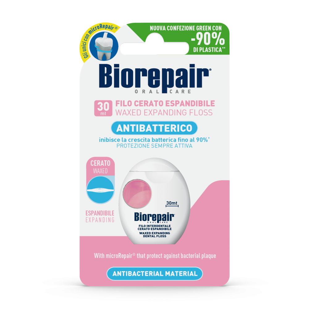 Це єдина зубна нитка з microRepair®, частинками, що складаються з тієї ж речовини, що й емаль, які проникають у місця, куди ваша зубна щітка не може дістатися, захищаючи від утворення зубного нальоту, який викликає карієс і запалення ясен. Зубна нитка Biorepair® Expanding спочатку тонка, потім розширюється при використанні, адаптуючись до всіх міжзубних проміжків, дозволяючи ефективніше видаляти зубний наліт навіть у найскладніших місцях. Складається з ультрам'яких ниток, рекомендується для чутливих і запалених ясен. Комбіноване щоденне використання зубної нитки Biorepair Expanding Dental Floss із Gialuronic Acid (гіалуроновою кислотою) та зубною пастою Biorepair®® Gum Protection, що загоює ясна, допомагає боротися з проблемами ясен і запобігати їм, одночасно відновлюючи зубну емаль. Зі свіжим м'ятним ароматом.
