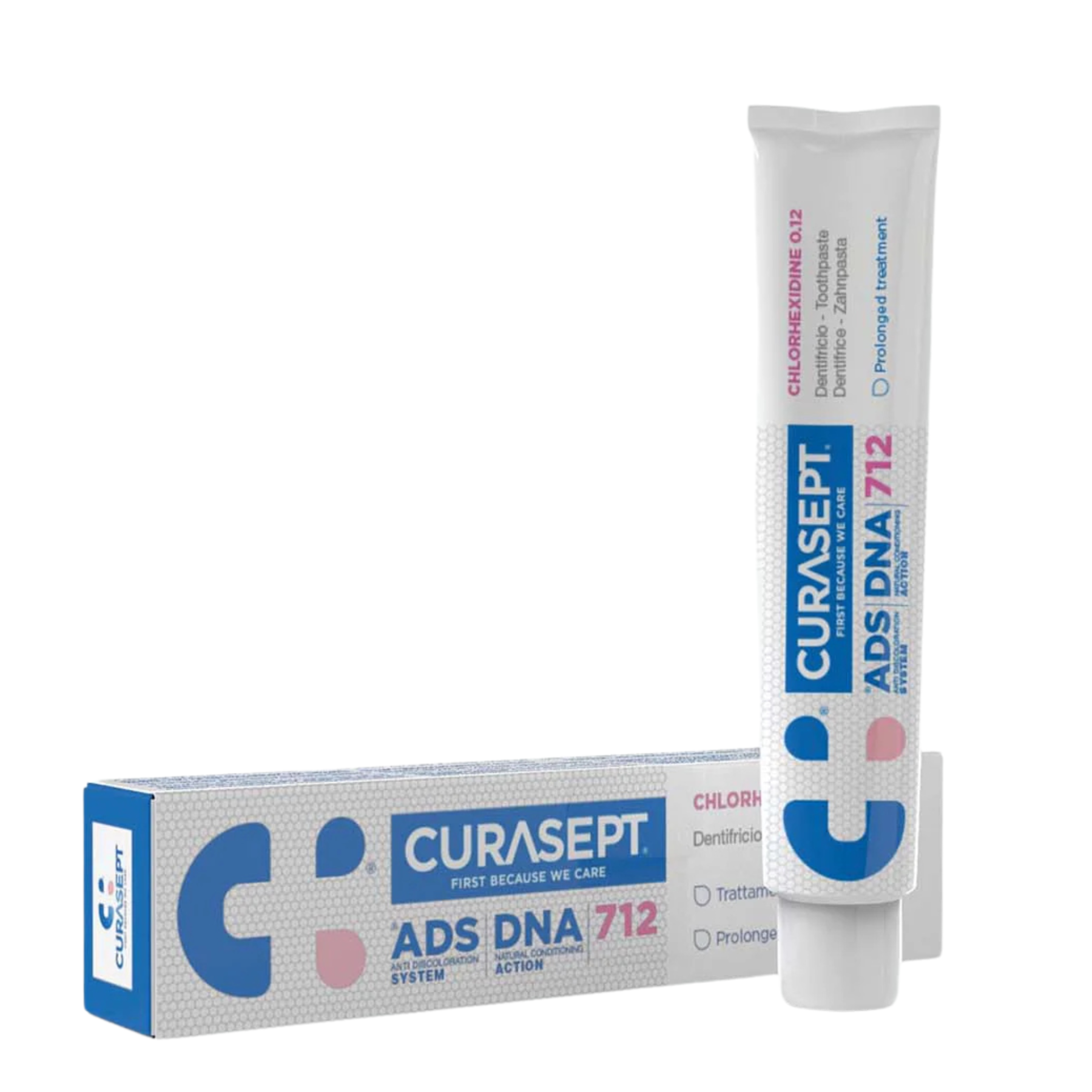 Зубна паста CURASEPT ADS 712 з сильним антибактеріальним ефектом, містить 0,12 % хлоргексидину і запатентовану систему ADS®, яка значно знижує ризик зміни кольору зубів і порушення смаку, викликаних застосуванням хлоргексидину, підтримує природну білизну зубів. Він ідеально підходить для лікування гінгівіту, пародонтиту, до і після операції, а також після професійної гігієни порожнини рота. Не містить SLS.