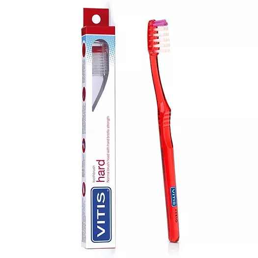 Зубна щітка VITIS HARD має жорстку щетину та головку стандартного розміру. Призначена для щоденного чищення зубів для дорослих людей, які не мають значних змін структури зубів чи ясен.