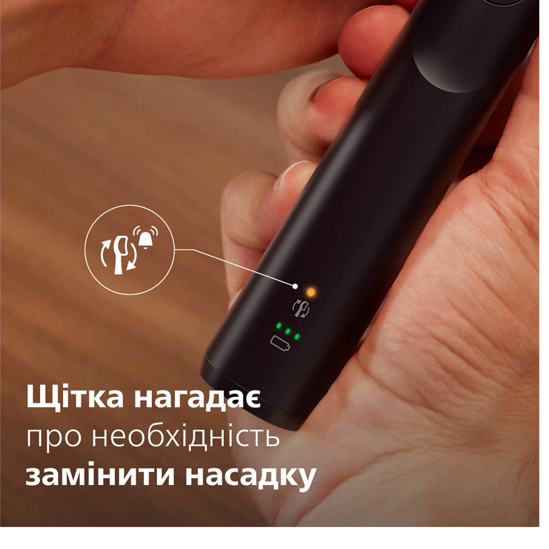 Нагадування про заміну.Чи знали ви, що насадки для щіток стають менш ефективними через три місяці? Стоматологи рекомендують регулярно заміняти насадку, тому зубні щітки Philips Sonicare оснащені нагадуванням про заміну насадки для щітки. Щітка відстежує, як часто і з якою силою ви чистите зуби, а потім нагадує вам про необхідність замінити насадку, коли настане час.