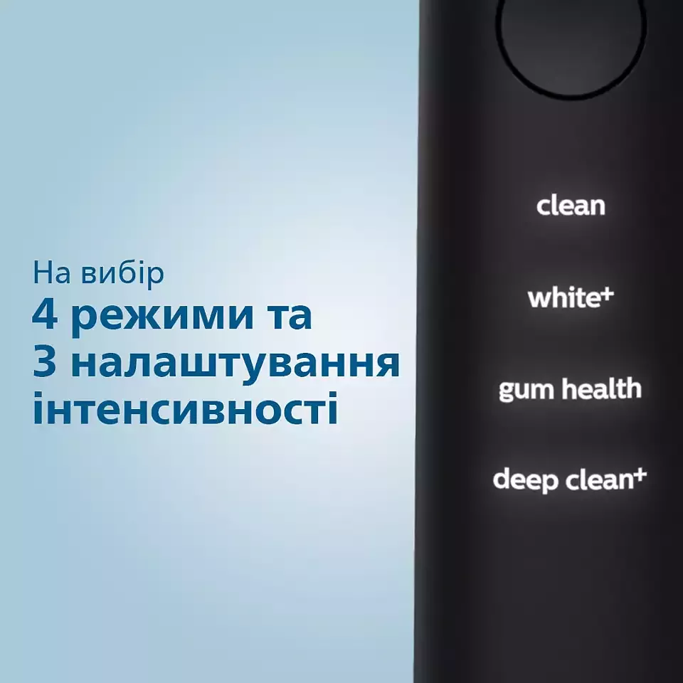 Чотири режими та три рівні інтенсивності для персоналізованого чищення. Виберіть один із чотирьох режимів чищення: «Чищення» для виняткового щоденного чищення, «Відбілювання+» для яскравості посмішки, «Здоров’я ясен» для м’якого, але ефективного чищення та «Ретельне чищення+» для глибокого чищення. Три налаштування інтенсивності (від низького до високого) дозволяють підвищити ефективність або доглядати за чутливими яснами.