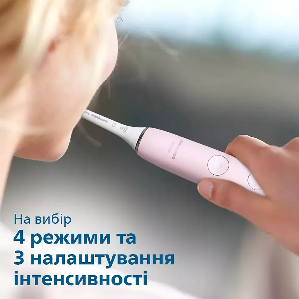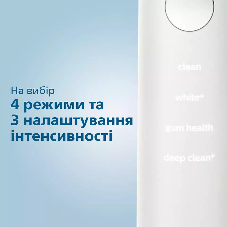 Чотири режими та три рівні інтенсивності для персоналізованого чищення. Виберіть один із чотирьох режимів чищення: «Чищення» для виняткового щоденного чищення, «Відбілювання+» для яскравості посмішки, «Здоров’я ясен» для м’якого, але ефективного чищення та «Ретельне чищення+» для глибокого чищення. Три налаштування інтенсивності (від низького до високого) дозволяють підвищити ефективність або доглядати за чутливими яснами.