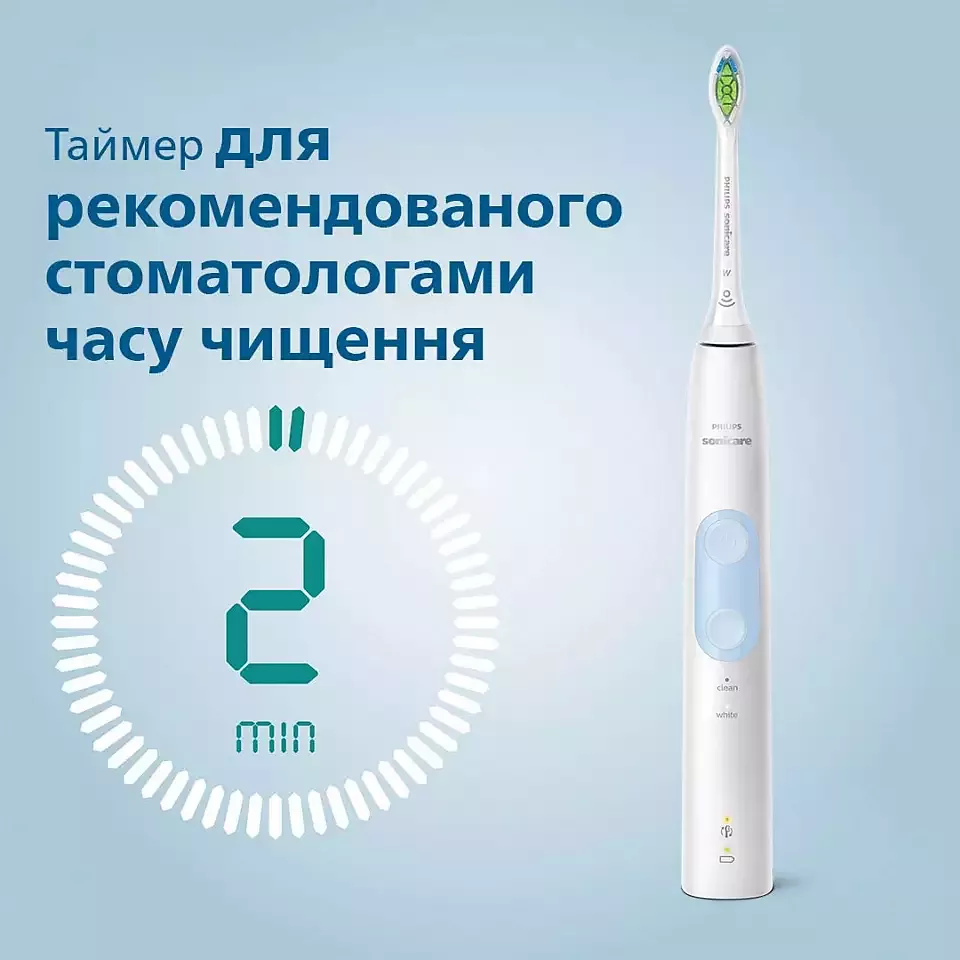 Комплектація: ручка Sonicare ProtectiveClean 4500, насадка-щітка Optimal White (W2), стандартний зарядний пристрій.